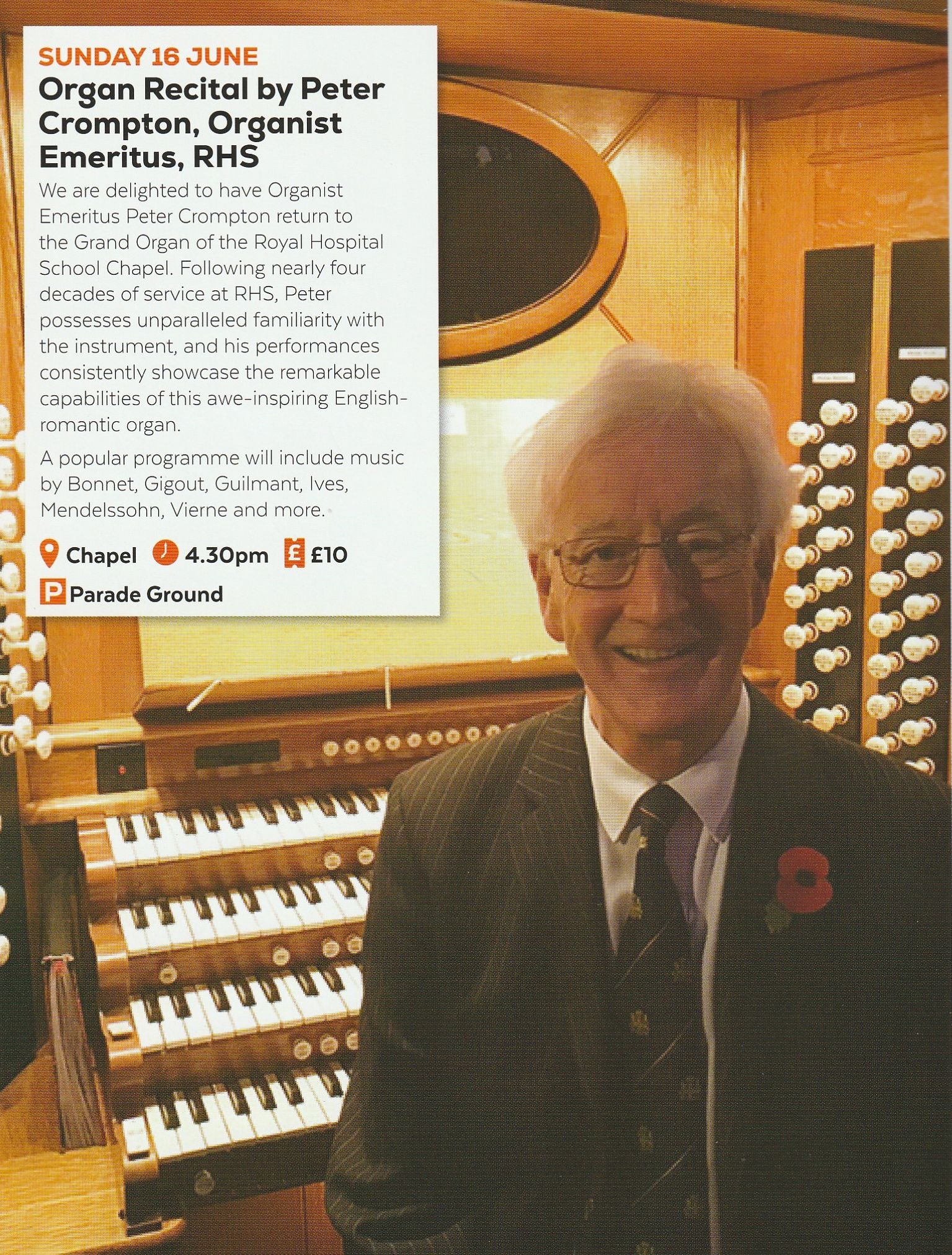 Our member and a former President of SOA, Organist Emeritus Peter Crompton is back at the Grand Organ of the Royal Hospital School Chapel. Hear a Hill, Norman and Beard 4-manual wonder! Having spent almost 40 years in post at RHS, Peter knows the organ better than anybody else and his recitals always bring out the best in this breathtaking English-romantic instrument.